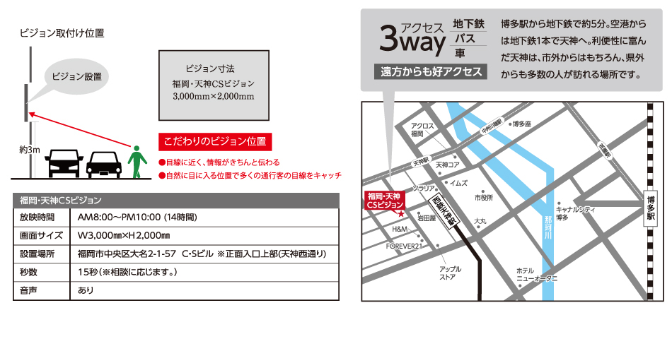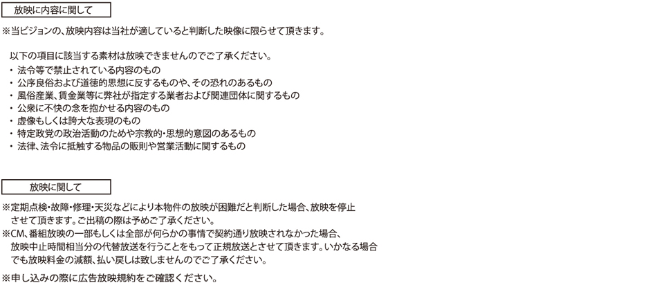 ※表示価格には消費税は含まれておりません。 ※申込金などは不要です。 ※当ビジョンの放映される会社及び商店様また放映内容は当社が適していると判断したものに限らせて頂きます。 ※放映開始は3月初旬を予定しておりますが、変更になる可能性がございます。予めご了承ください。15秒CM以外にも放映可能です。詳しくは広宣HPをご覧ください。 ※動画製作料金は含んでおりません。