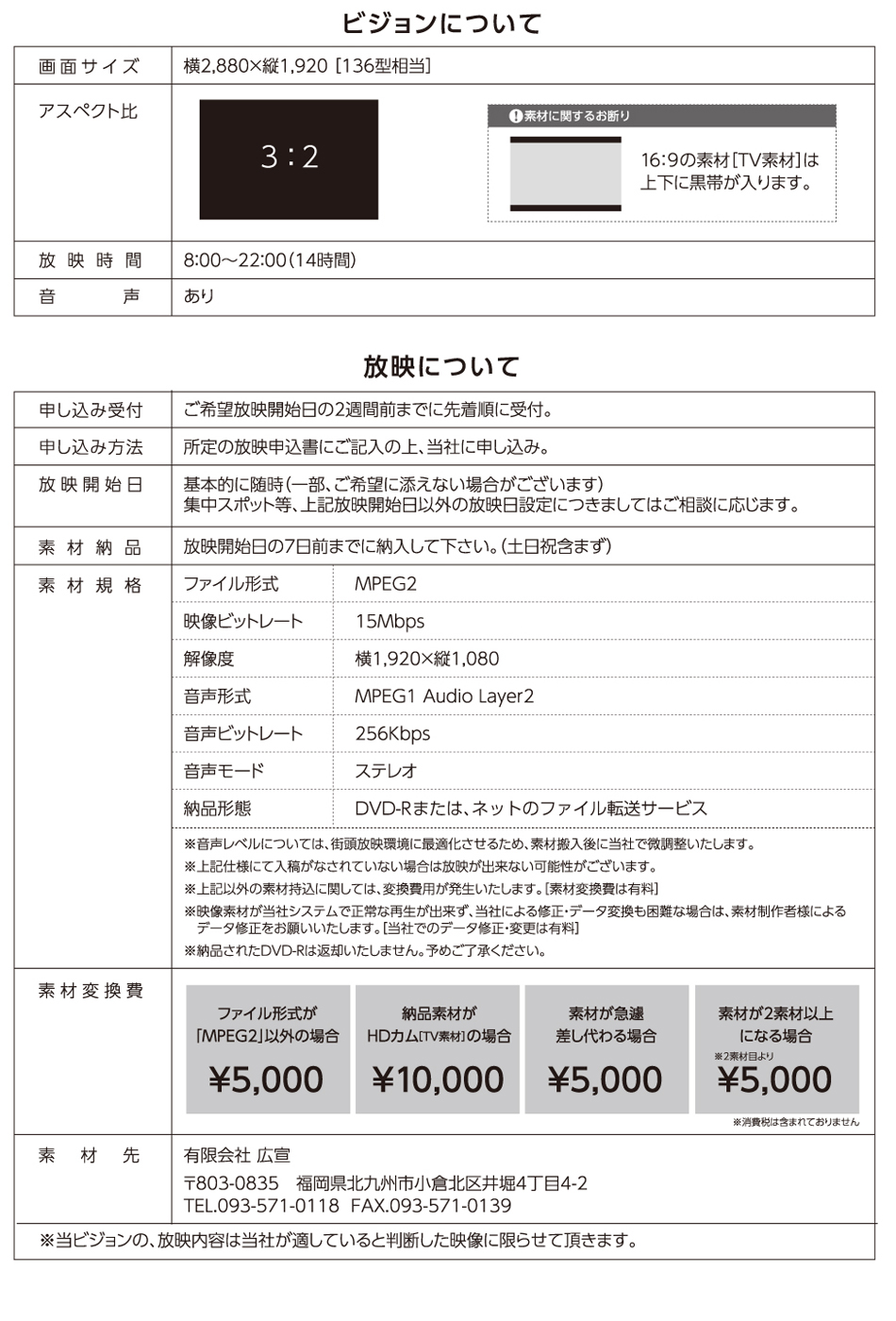 ※ 放映期間は1日から承ります。 また上記プラン以外にも対応できますのでお気軽にお問合せ下さい。